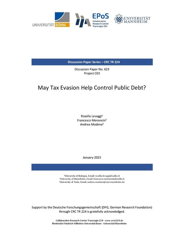 May Tax Evasion Help Control Public Debt? 623/2025, C03, Rosella Levaggi, Francesco Menoncin, Andrea Modena CRCTR224_2025_623.pdf application/pdf application/pdf Size 463.9 KB Download