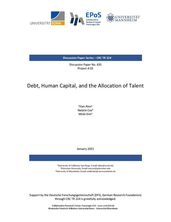 Debt, Human Capital, and the Allocation of Talent 635/2025, A03, Titan Alon, Natalie Cox, Minki Kim CRCTR224_2025_635.pdf application/pdf application/pdf Size 955.6 KB Download