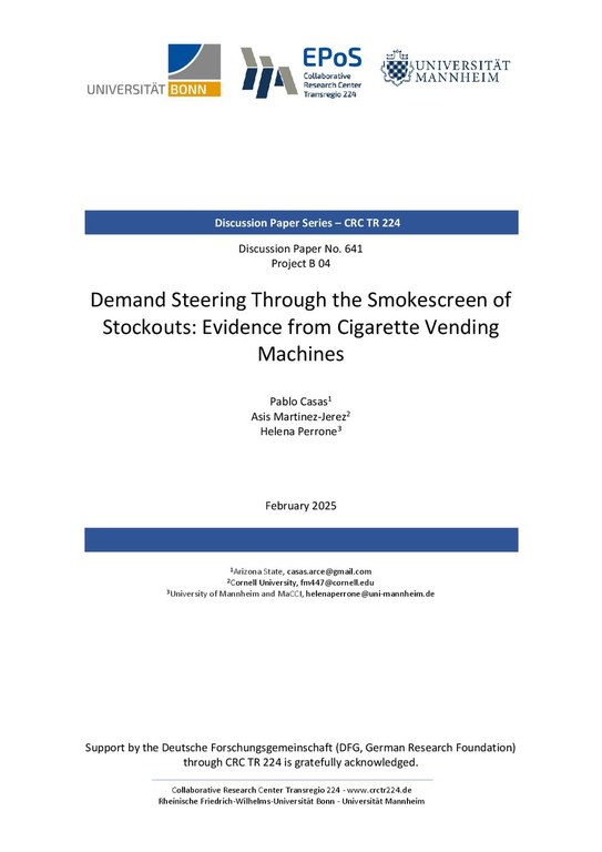Demand Steering Through the Smokescreen of Stockouts: Evidence from Cigarette Vending Machines 641/2025, B04, Pablo Casas, Asis Martinez-Jerez, Helena Perrone CRCTR224_2025_641.pdf application/pdf application/pdf Size 361.3 KB Download