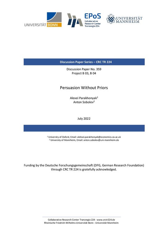 Persuasion without Priors 359/2022, B03, B04, Alexei Parakhonyak, Anton Sobolev. Forthcoming in Economic Theory CRCTR224_2022_359.pdf application/pdf application/pdf Size 1.1 MB Download