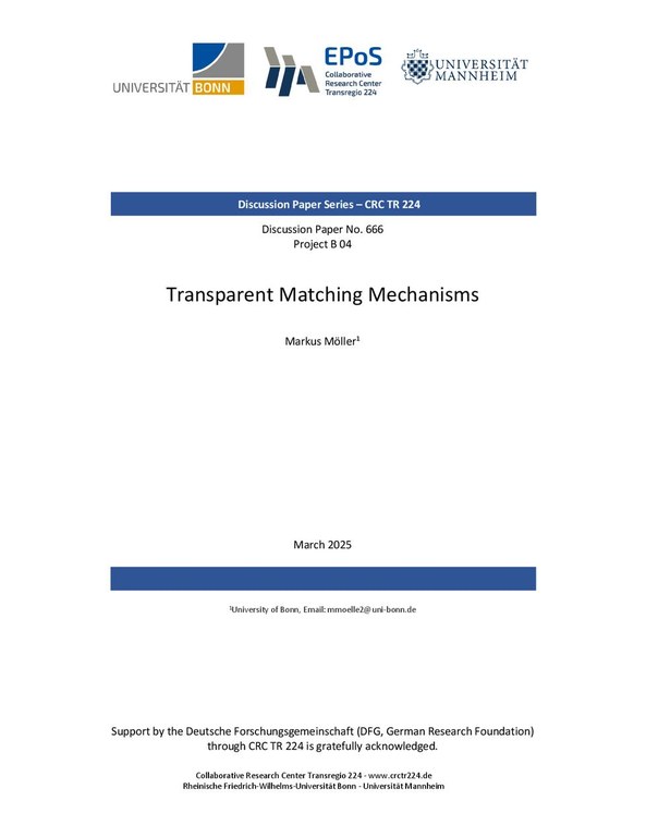 Transparent Matching Mechanisms 666/2025, B04, Markus Möller. Forthcoming in Theoretical Economics CRCTR224_2025_666.pdf application/pdf application/pdf Size 483.7 KB Download