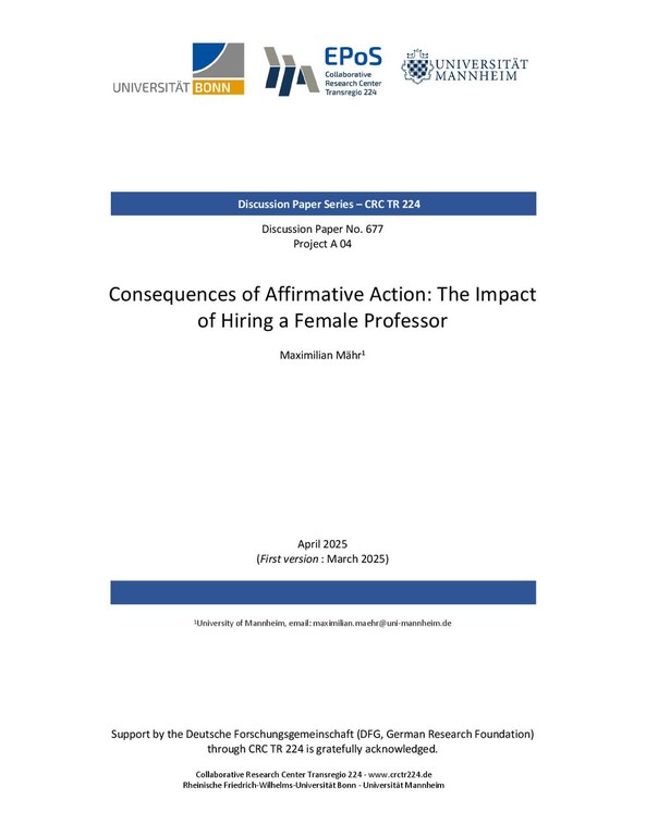 Consequences of Affirmative Action: The Impact of Hiring a Female Professor 677/2025, A04, Maximilian Mähr. First version: March 2025 CRCTR224_2025_677v2.pdf application/pdf application/pdf Size 6.8 MB Download